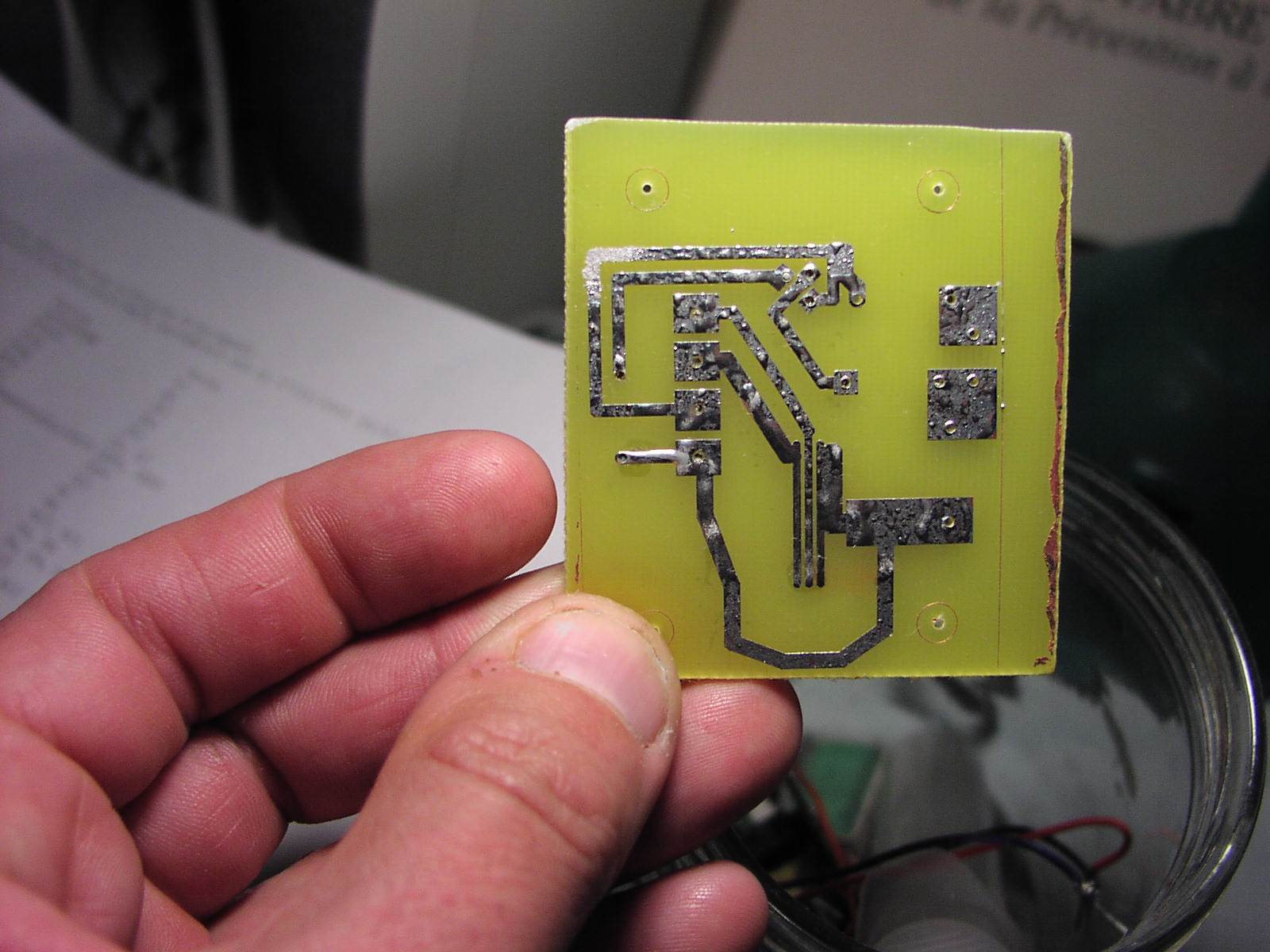 c'est normal que le fil à souder fondu ne tienne pas sur le cuivre de la plaque : la plaque est froide (25°C), l'étain n'accroche que des surfaces chaudes. Pour que l'étain fondu tiennent parfaitement sur la plaque, il faudrait que la température de l'étain soit la meme que la température de la plaque. Si tu met ta plaque au four pour la chauffer, elle va s'oxyder et ca va pas aller non plus.